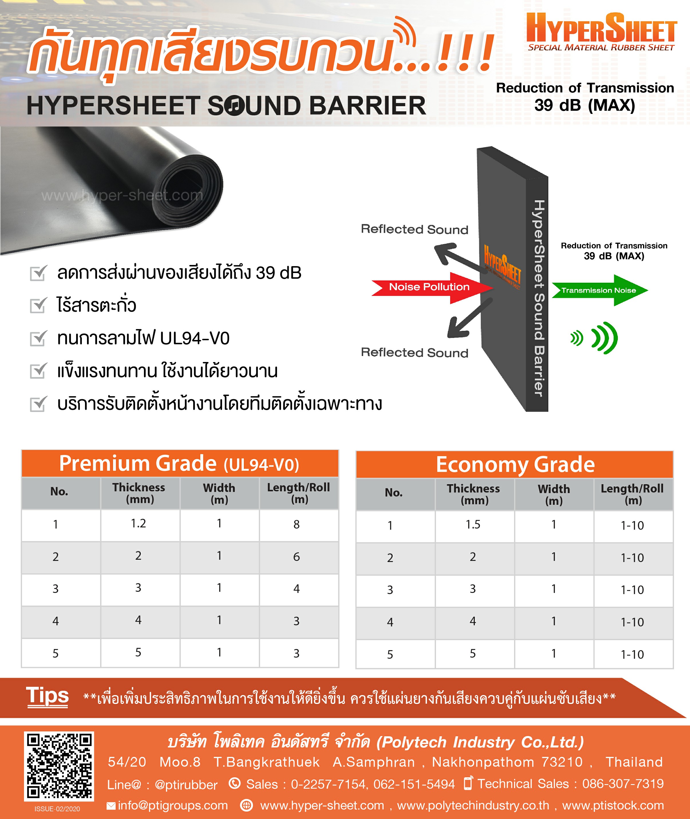 แผ่นยางกันเสียง Soundproofing Rubber Sheet หรือ Hypersheet Sound Barrier แผ่นยางช่วยลดการผ่านของเสียง ลดเสียงดัง ไม่ว่าจะเป็นเสียงจากด้านนอกเข้าไปยังในห้อง หรือเสียงจากในห้องออกไปยังข้างนอก แผ่นกันเสียง " HyperSheet Brand" แตกต่างจากแผ่นยางทั่วไป ด้วยสูตราที่เรามีการพัฒนา ระดับ Density ที่มีประสิทธภาพมากพอช่วยลดการผ่านของเสียง เหมาะสำหรับการใช้งานกับโครงสร้างอาคารที่พักอาศัย โรงแรม คอนโดมิเนียม ห้องประชุมสัมนา ห้องบันทึกเสียง ห้องเครื่อง โรงงานอุตสาหกรรมต่างๆ แผ่นยางกันเสียง Hypersheet เรามีจำหน่าย 2 เกรดการใช้ Economy Grade และ Premium Grade